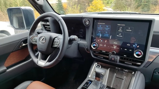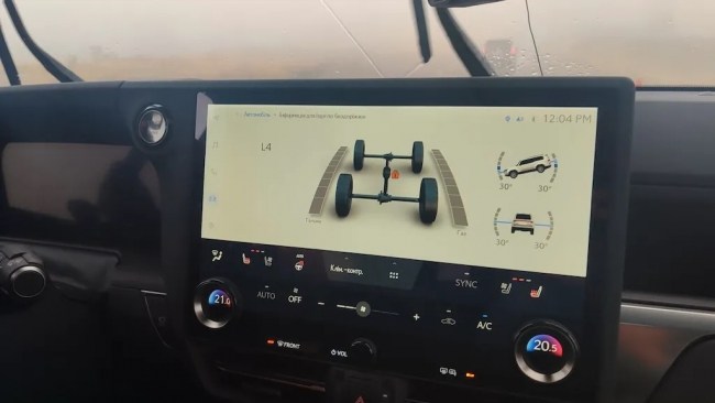 Центральна частина в салоні відведена великому 14-дюймовому сенсорному дисплею. На нього виводиться маса різної інформації та функціоналу. В тому числі та дані про температуру масла у двигуні, або кут крену авто на бездоріжжі.
